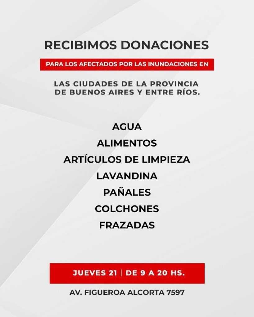 De esta forma, hoy jueves 21 de marzo, el estadio Monumental (ubicado en Avenida Figueroa Alcorta 7597) estará abierto hasta las 20 horas para recibir donaciones las cuales serán destinadas a colaborar con aquellas personas que sufrieron pérdidas materiales por las tormentas.