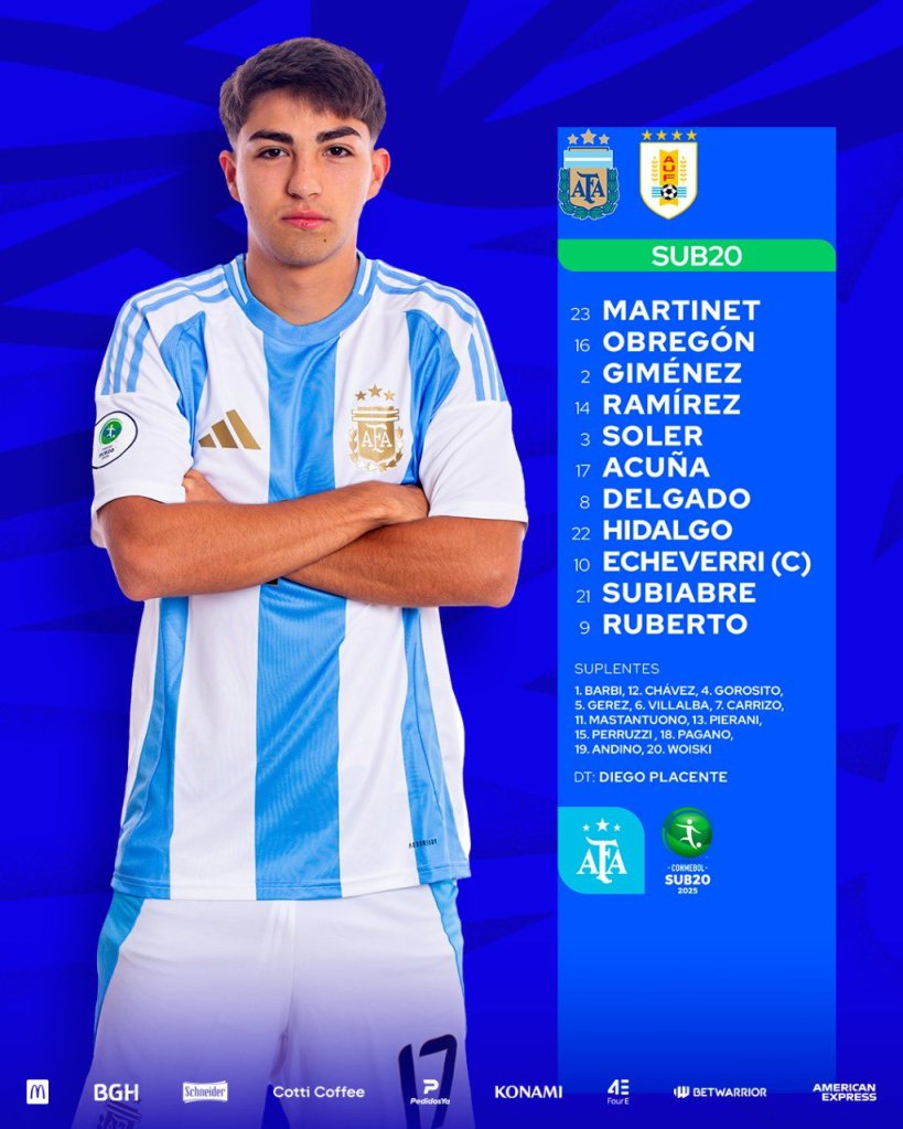 Amonestados: 45′ PT Julio Soler; 45′ ST Franco Mastantuono.